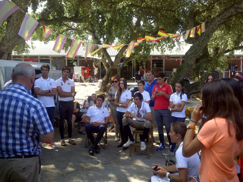 La delegación española, encabezada por Mike Florence, ha realizado su entrenamiento matutino y todos los componentes de la misma, tanto jinetes como caballos, se encuentran en perfectas condiciones para afrontar esta ilusionante competición. los entrenadores particulares de los jinetes asisten y se esfuerzan tanto en el trabajo técnico como en generar buen ambiente, (pese a lo que parezca en la imagen con «Kiki» de animador).